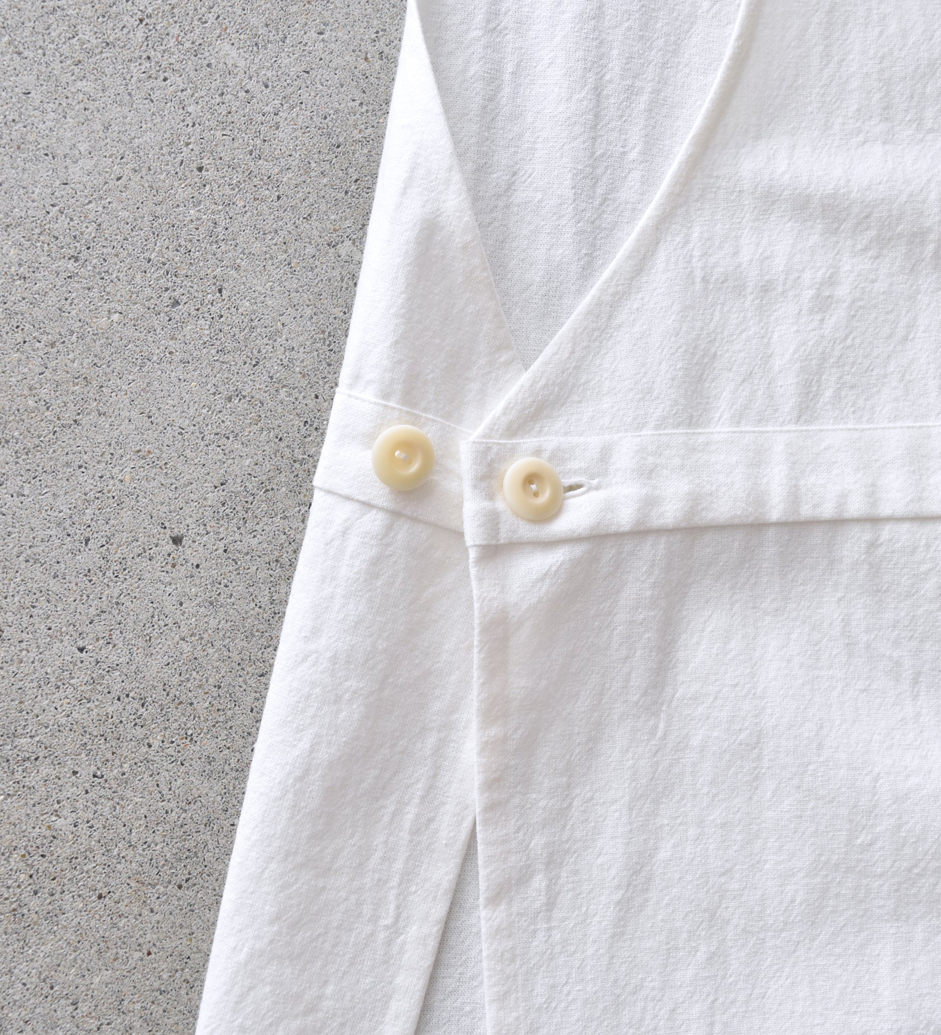 衿がコンパクトなドロップショルダーのワイドスクエアシャツです。ボタンは琵琶湖で淡水真珠を作っている池蝶貝を使用しています。衿付きのシャツが苦手な方にもぜひ着ていただきたい一枚です。