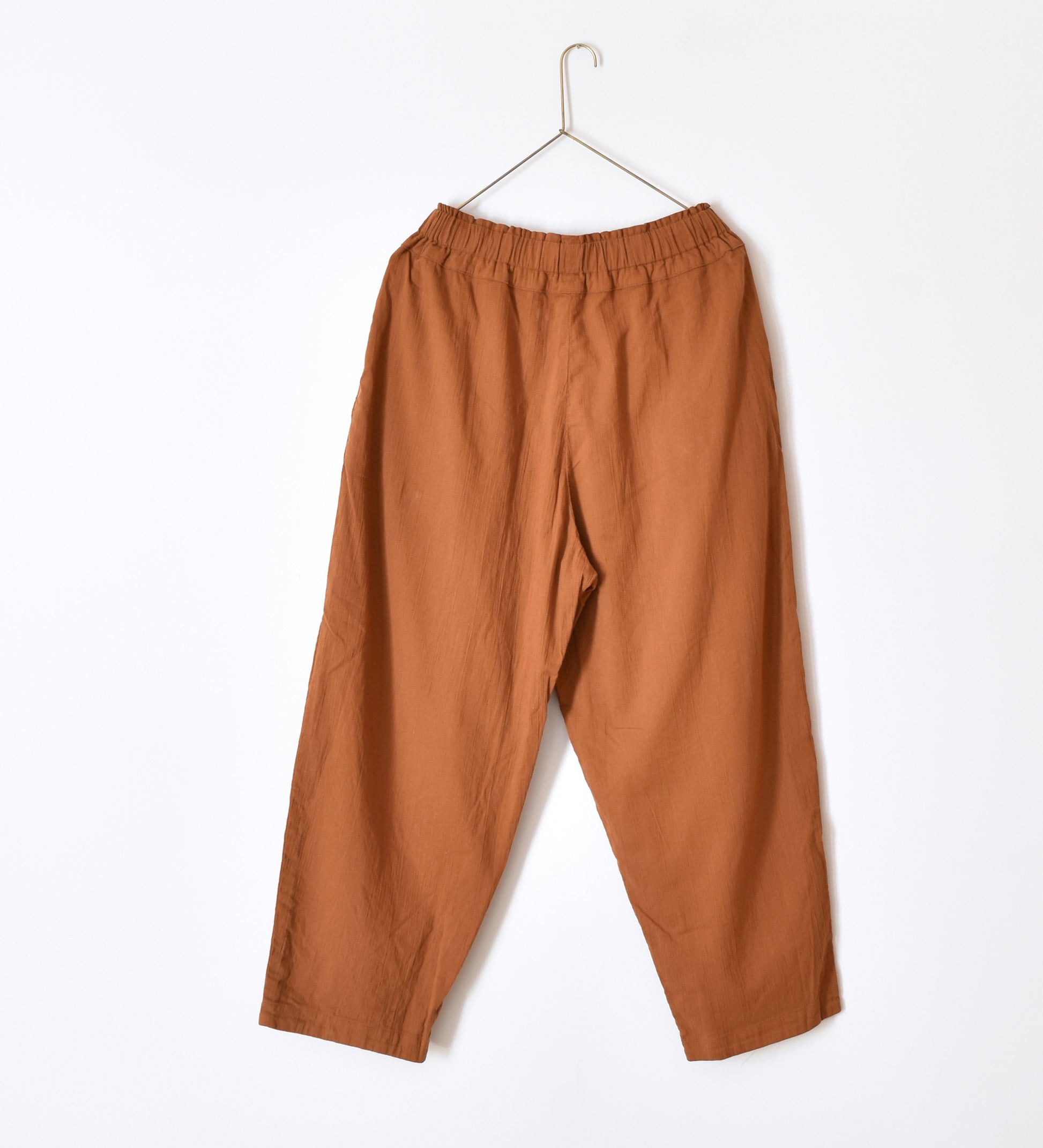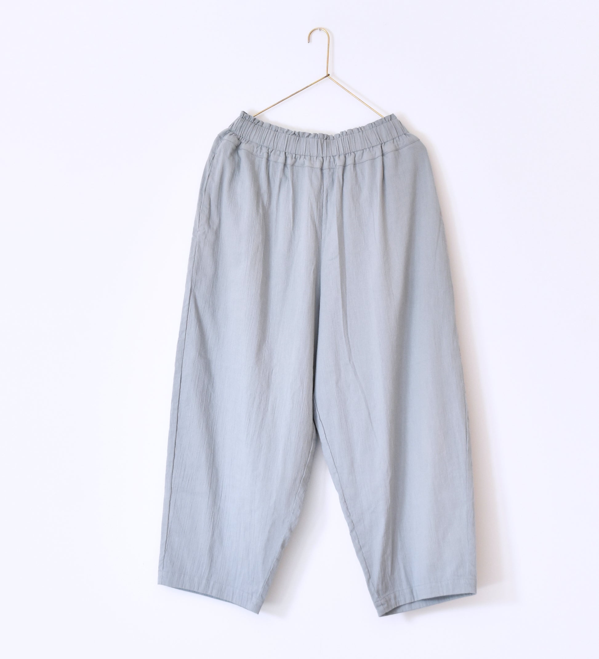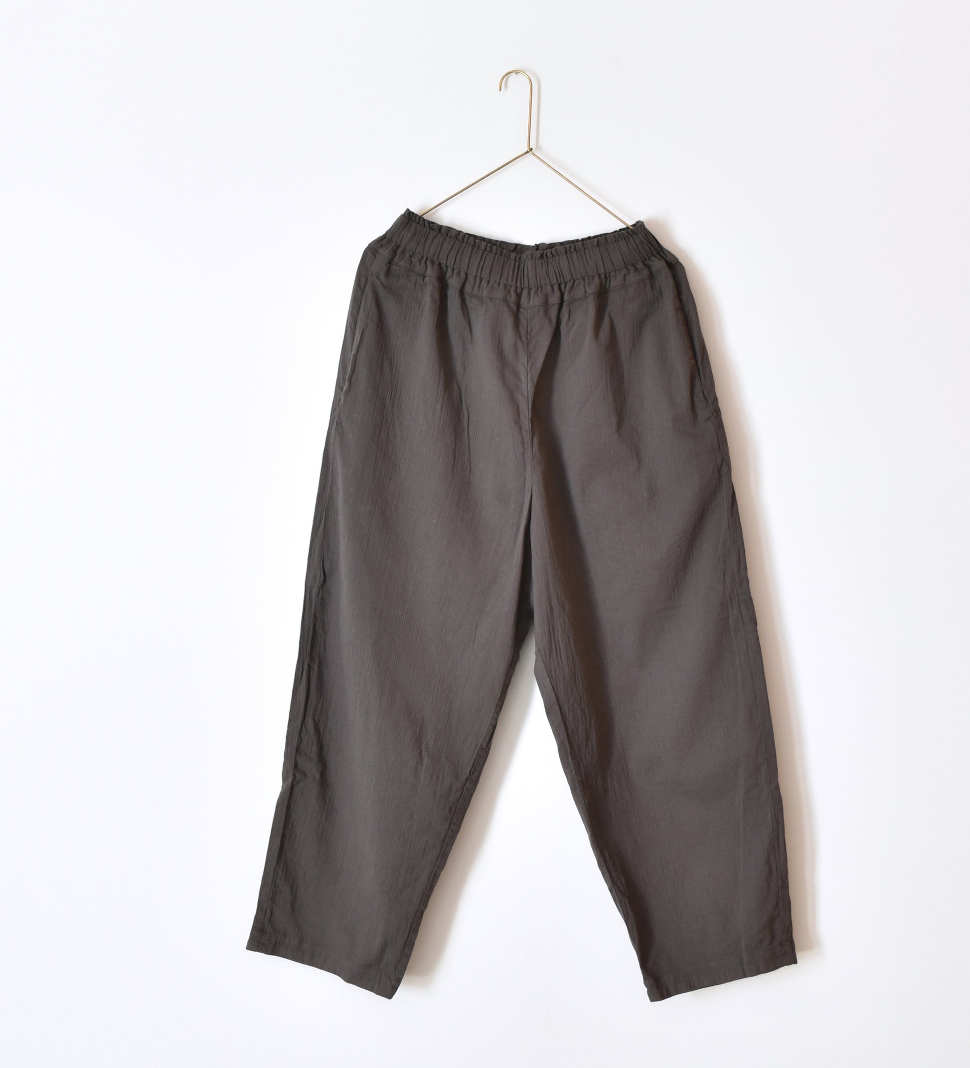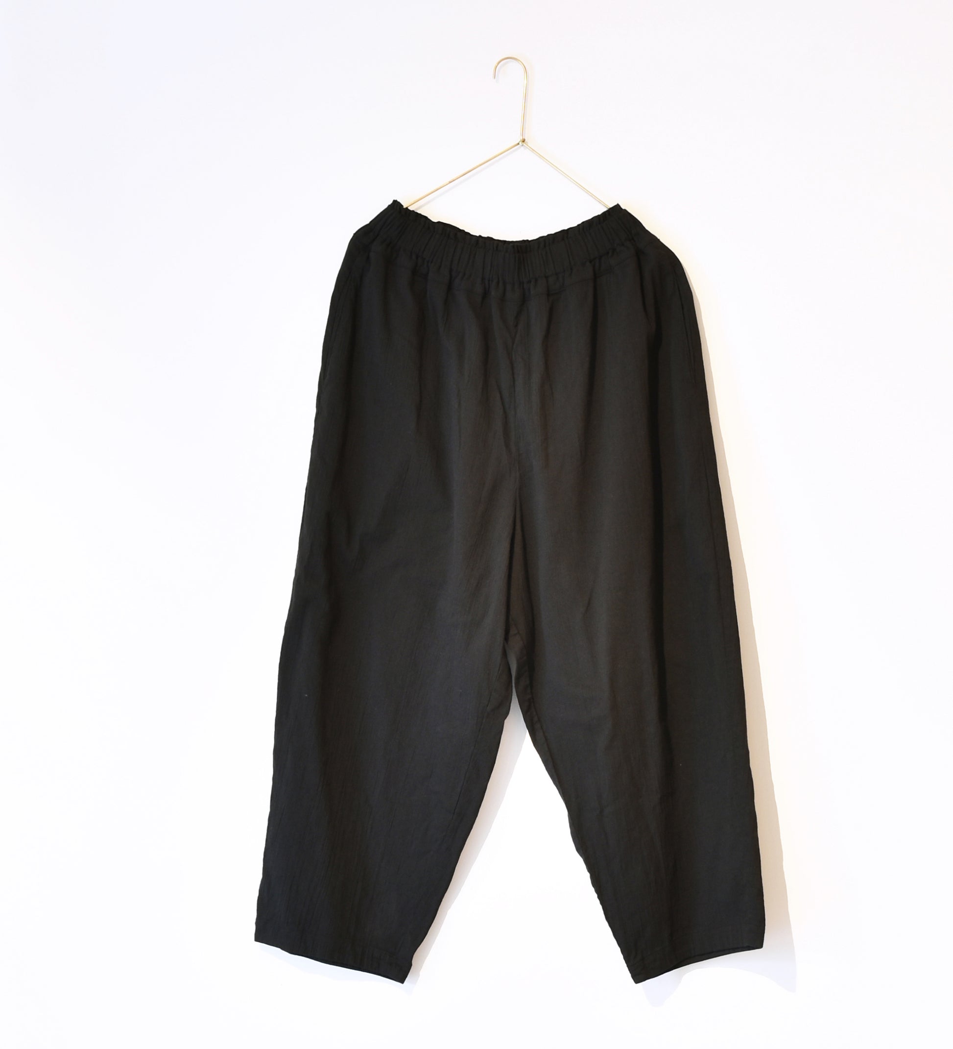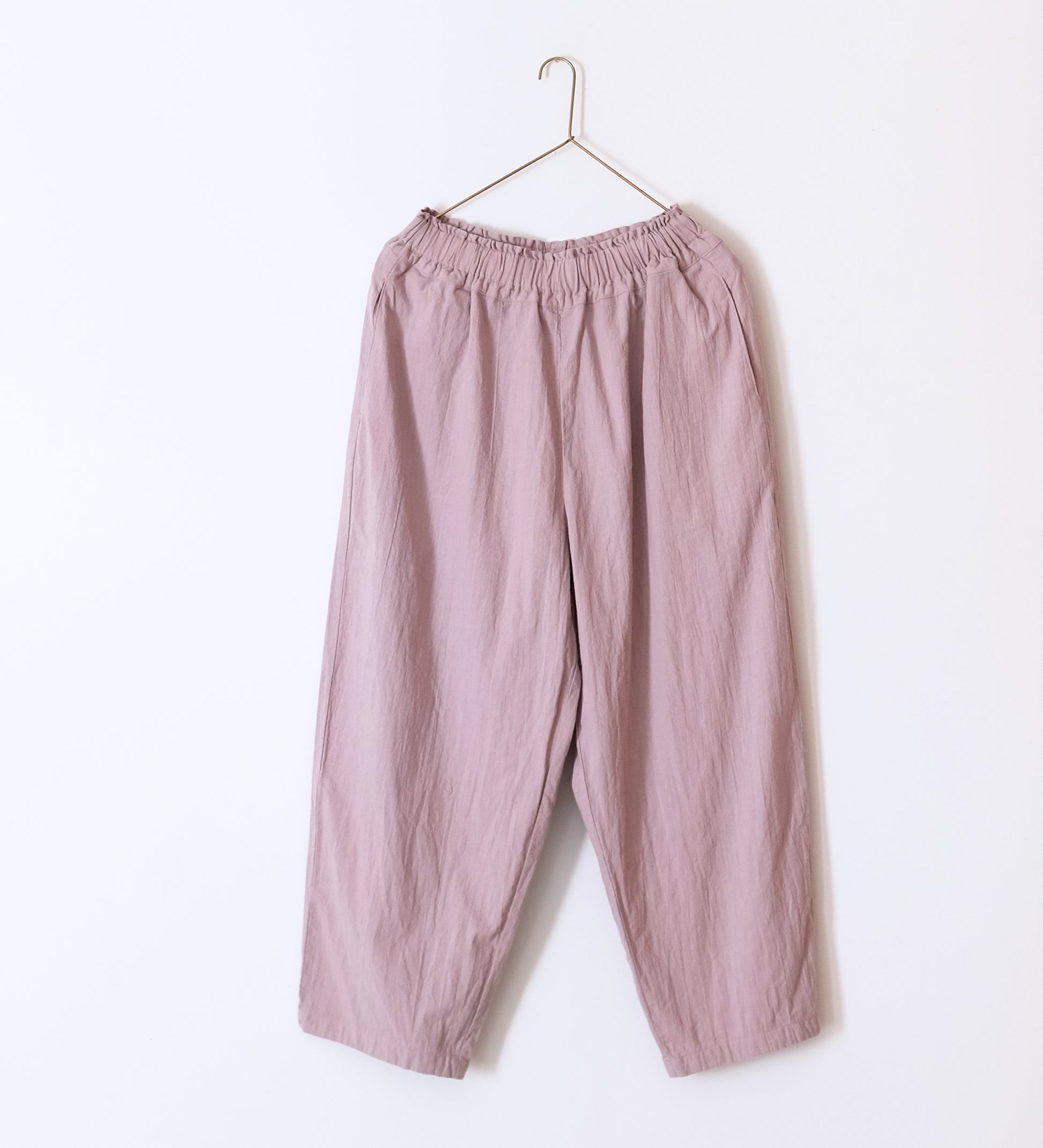 ウエストがゴムと紐で調整できるコクーンパンツです。ヒップ、ももまわりをゆったりとし、すそに向かって細くなっているので、すっきりとかろやかな印象になります。