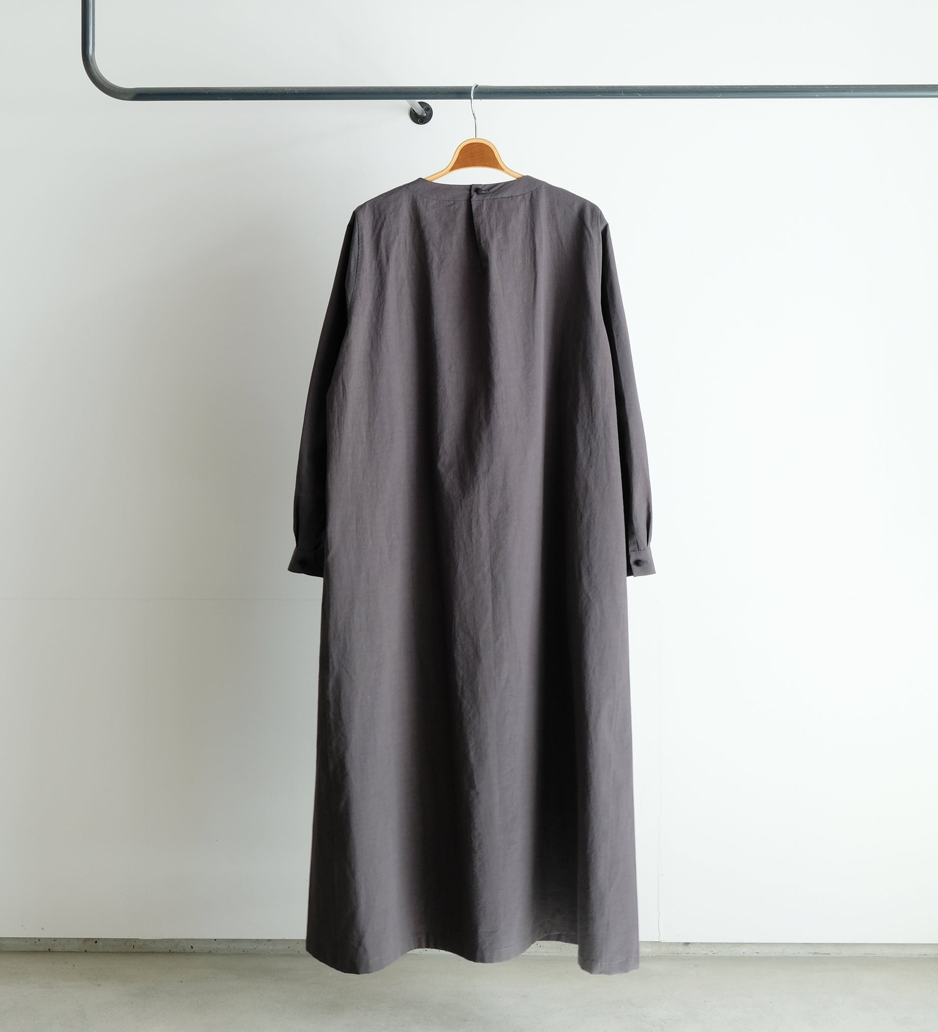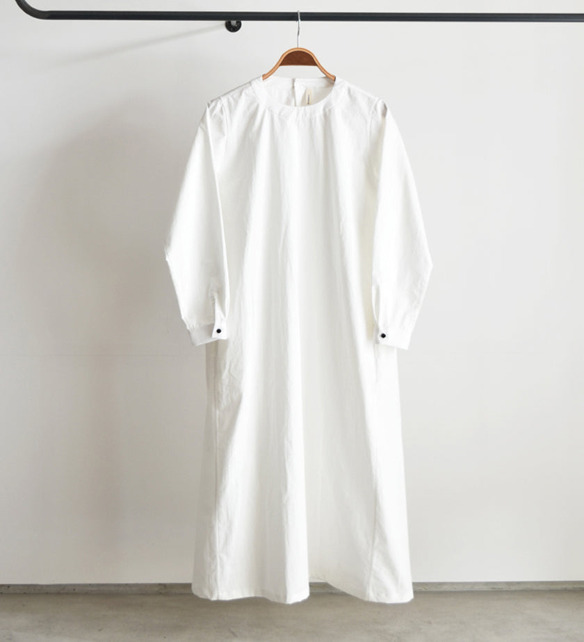 首まわりの作りと、4枚パネルになっている身頃が特徴のクルーネックワンピースです。袖口と首の後ろにあるボタンに黒の包みボタンを付けることにより、形と相まってフォーマルな雰囲気があります。すっきりと綺麗で立体的な形なので、日常から少し改まった場面まで、幅広く活用する一着です。脇にはポケットもあり実用的です。