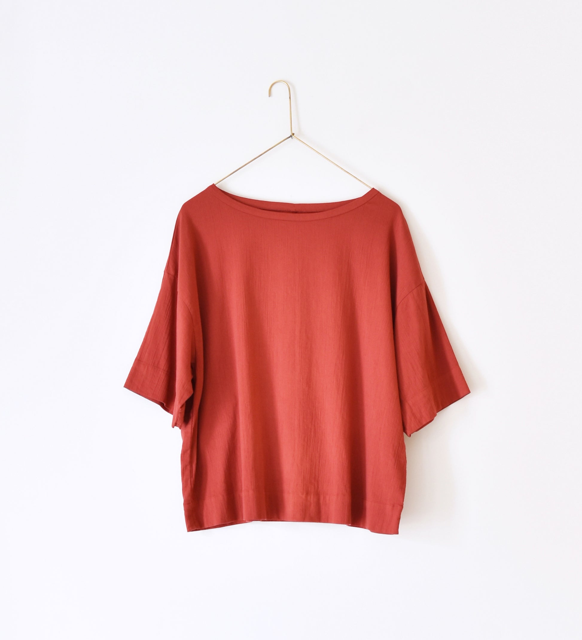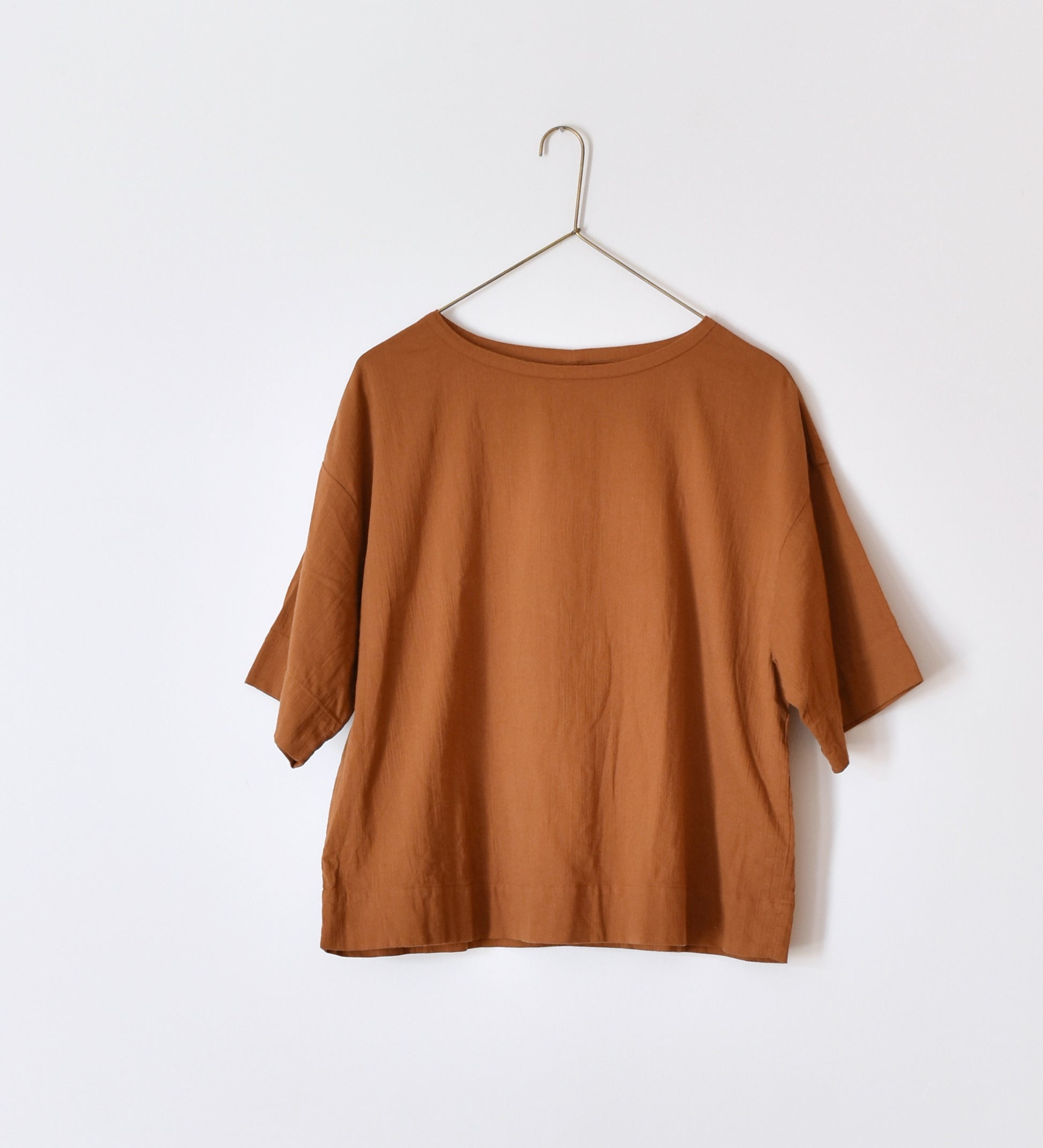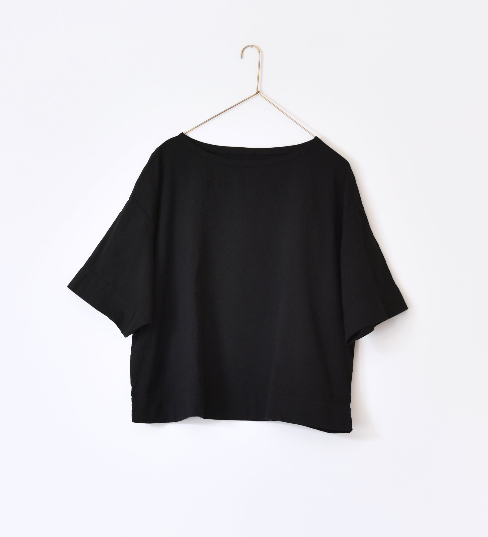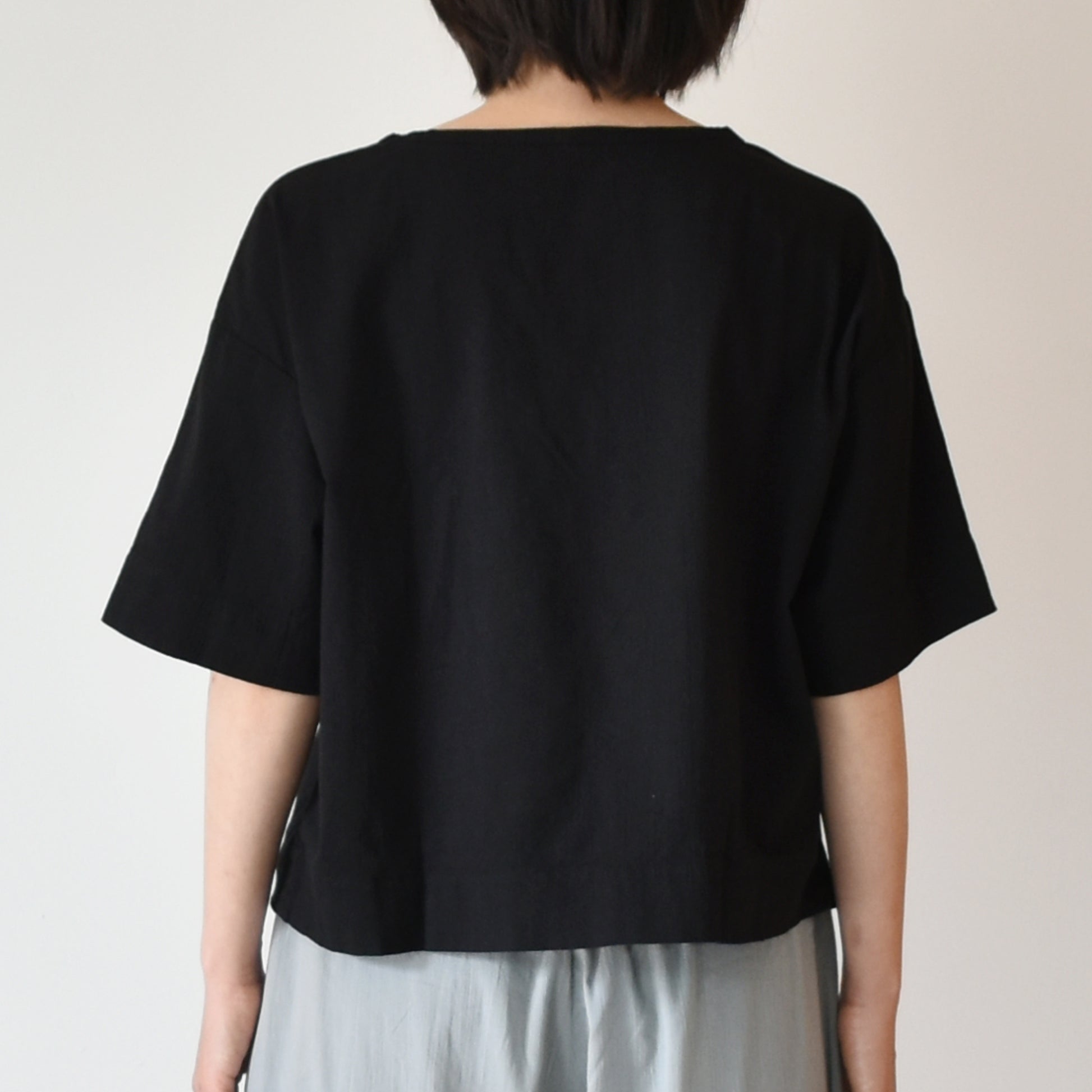 伸縮性のあるやわらかい生地はふんわりとした綺麗な形をつくり、気持ちがよく、涼やかな着心地です。袖を折り返して着ていただくのもおすすめです。