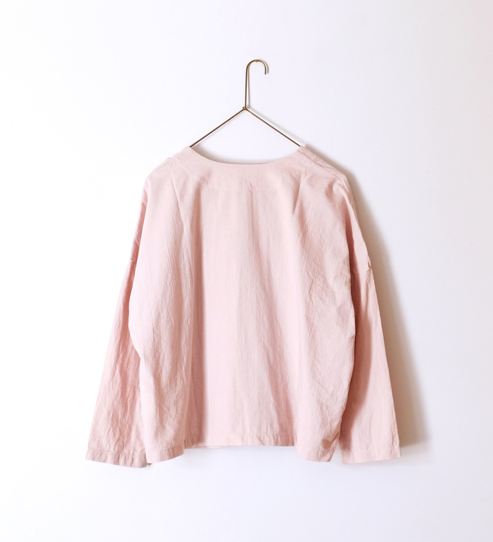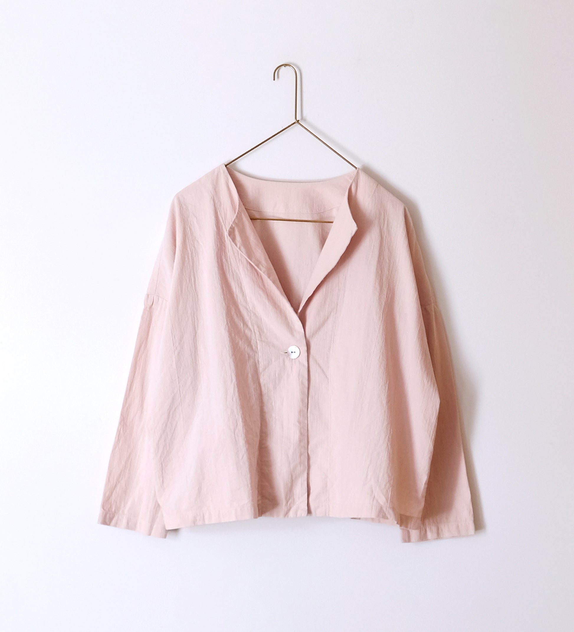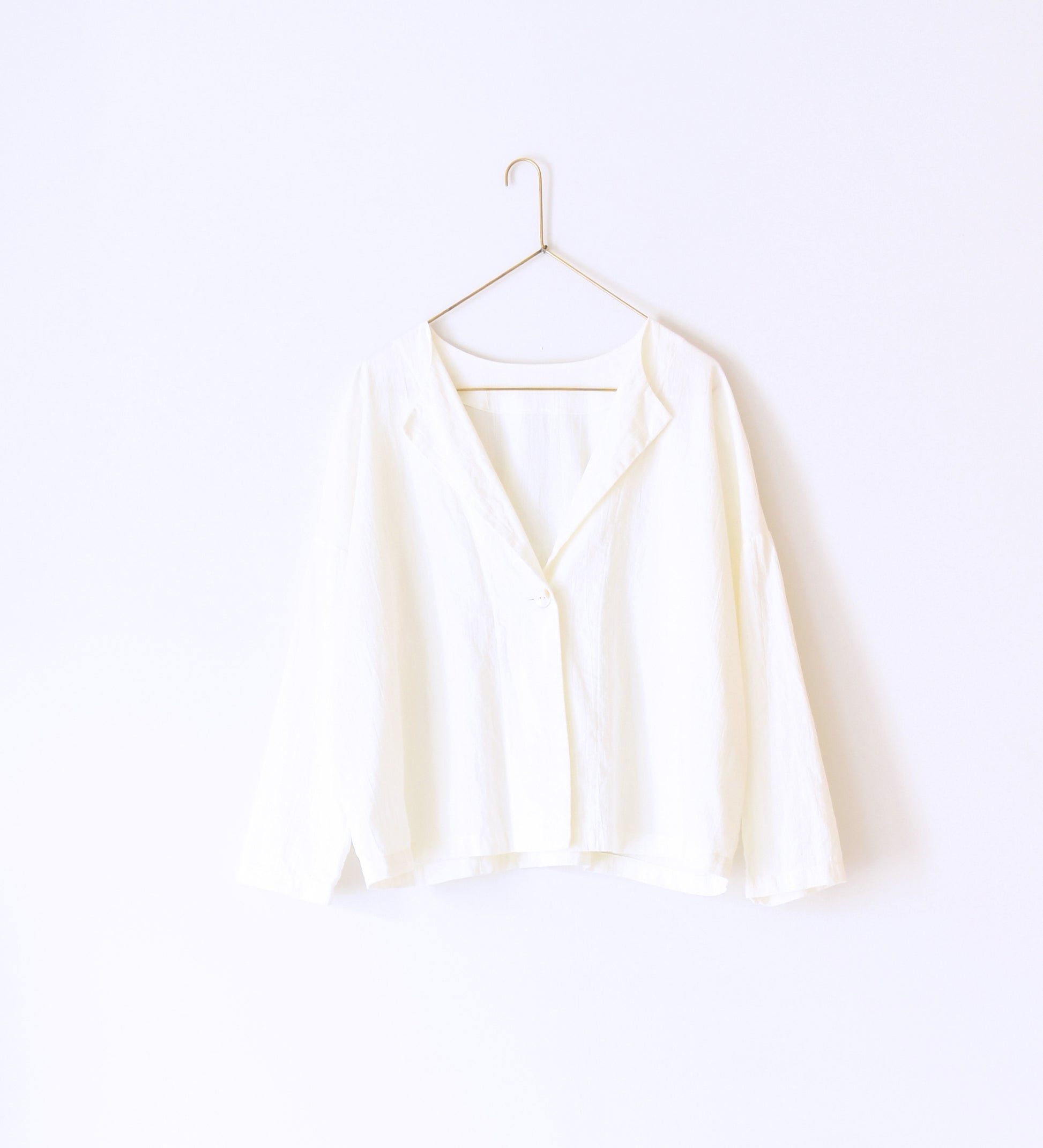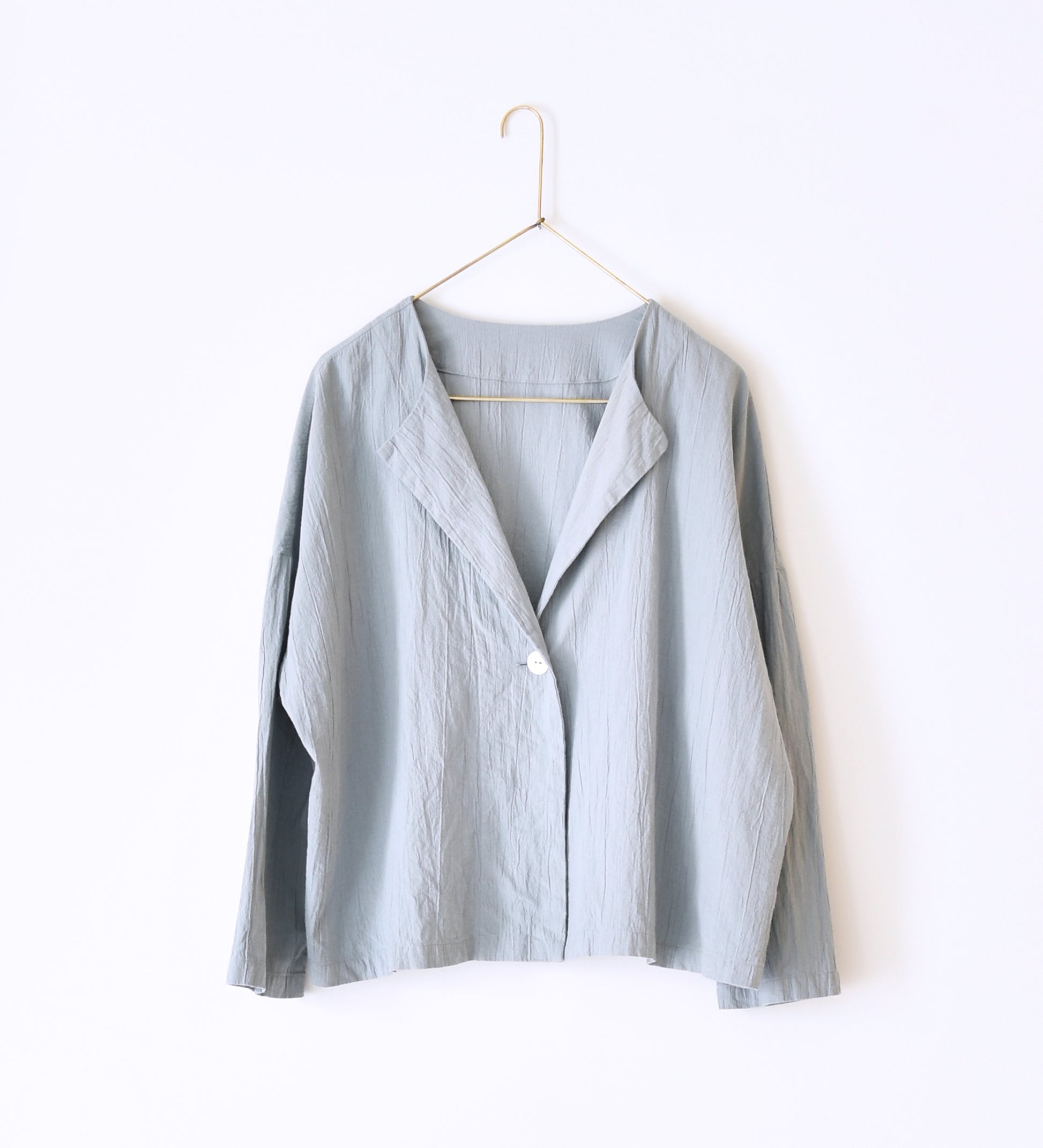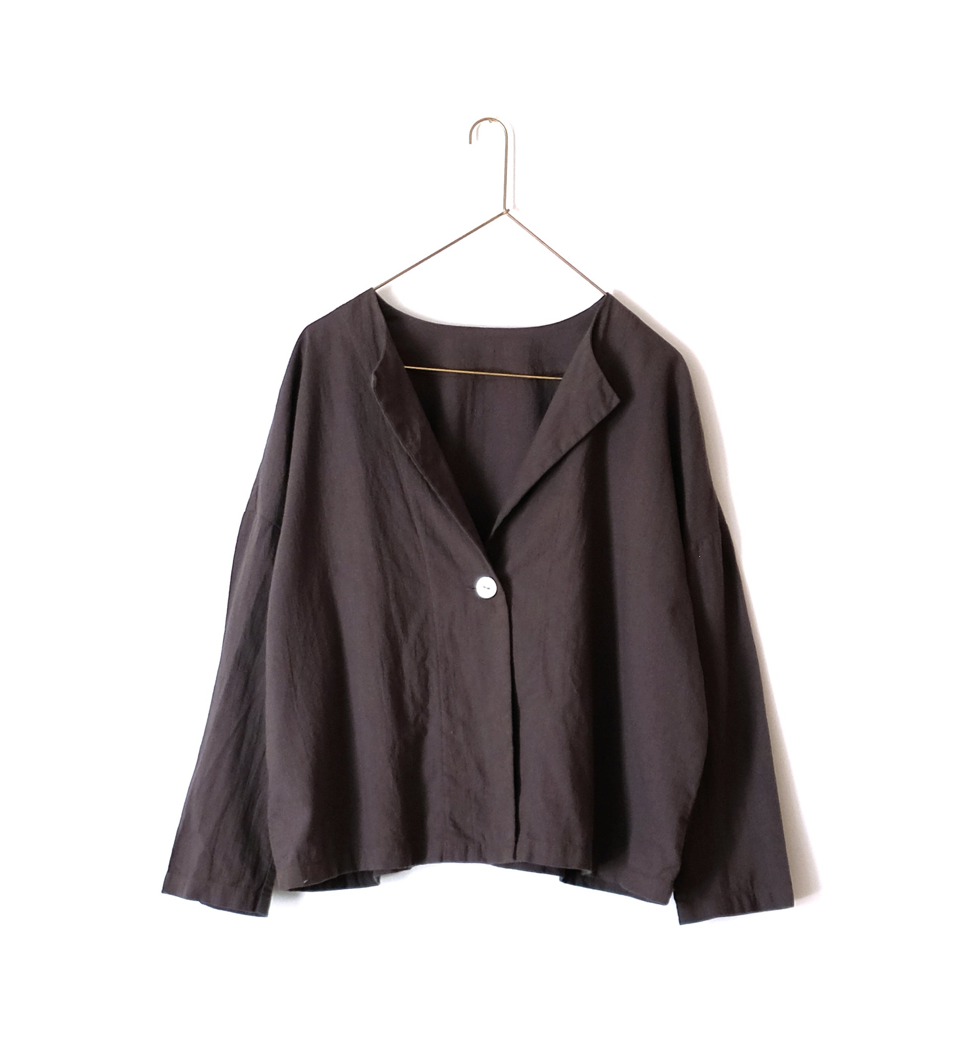羽織ったり、ボタンを閉じたりさまざまな着方ができる一着です。セットアップで他のボトムスと合わせるのもおすすめです。釦には琵琶湖で淡水真珠を作る池蝶貝を使っています。