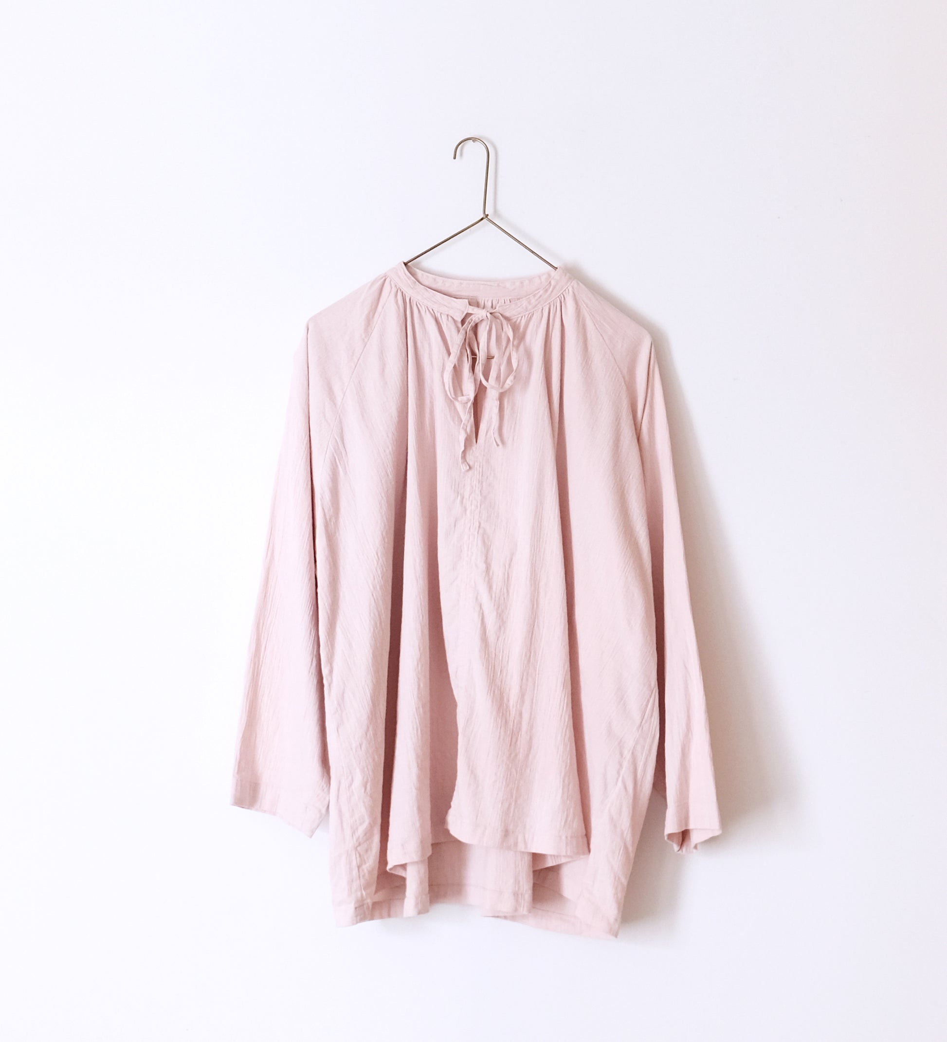 ギャザーがたっぷり入ったプルオーバーギャザーチュニックです。首回りの紐で、開けたり閉めたりと色々な着方を楽しんでいただけます。ふんわりとしていて、肌につかないので夏の日よけにも使っていただけます。
