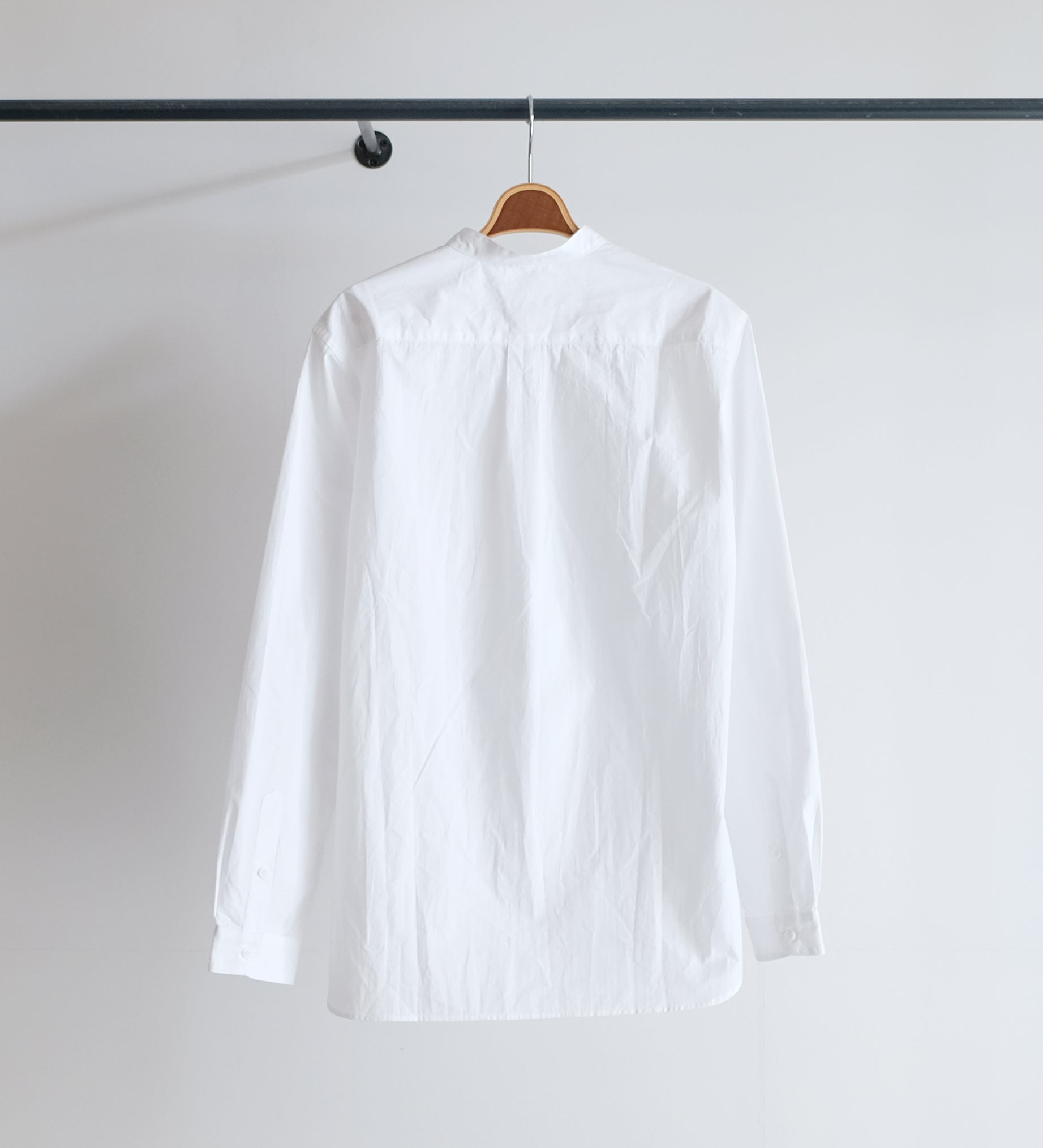洗いざらしで着ていただきたいスタンドカラーシャツです。裾に丸みをもたせ、裾の脇にはマチを入れて、クラシックな印象に仕上げました。サックスの生地は機織り後、滋賀県で加工したものとなります。肌触りが柔らかく、とろみがあるのが特徴です。